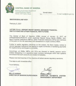 According to a circular with reference number; BSD/DIR/GEN/LAB/14/001 and dated Friday, February 5, 2021, the apex Bank ordered all financial institutions “to identify persons and/or entities transacting in or operating crypto currency exchanges within their systems and ensure that such accounts are closed immediately”.