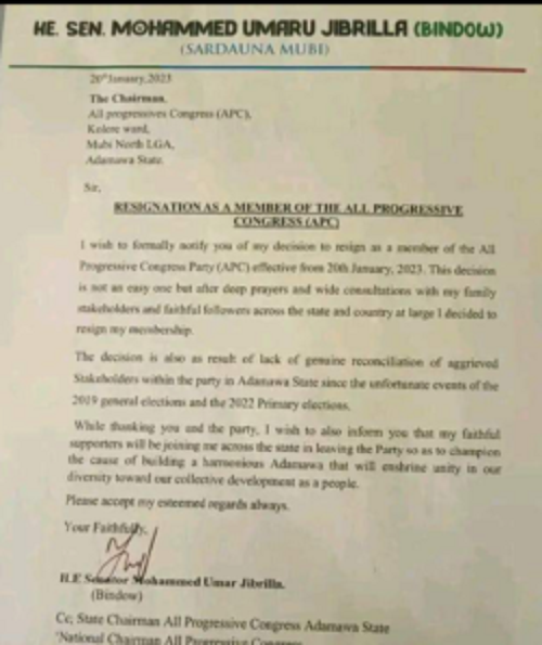 Bindow, who cited unresolved party crisis as his reason for leaving the party, resigned via a letter dated 20th January 2023 and addressed to the APC chairman of his Kolere Ward, Mubi North Local Government Area of Adamawa State.