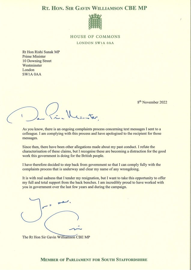 In his response, Sunak said he was accepting Williamson’s resignation with “great sadness” but added that he supported his decision to stand down. The prime minister also thanked his political ally for his “personal support and loyalty” and the work he had done during his brief spell in government.